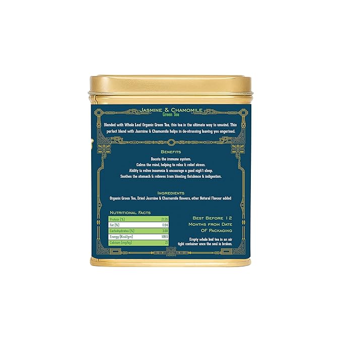 • HEALTH BENEFITS : Boosts the immune system Soothes the stomach and relieve from bloating, flatulence, and indigestion. Calms the mind and help to relax and relieve stress. Helps in relieving insomnia.:- Fragrant jasmine flowers and soothing chamomile blossoms create a floral green tea infusion.
