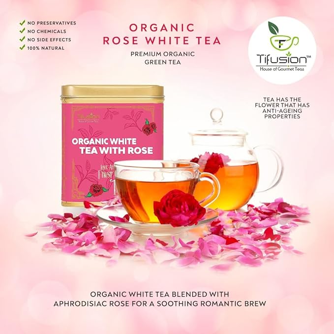 - Tifusion Organic White Tea with Rose is a refreshing beverage that offers numerous benefits for both healthy hair and glowing skin. This tea contains organic white tea, which is known for its high antioxidant content, helping to combat free radicals and promote overall skin health.