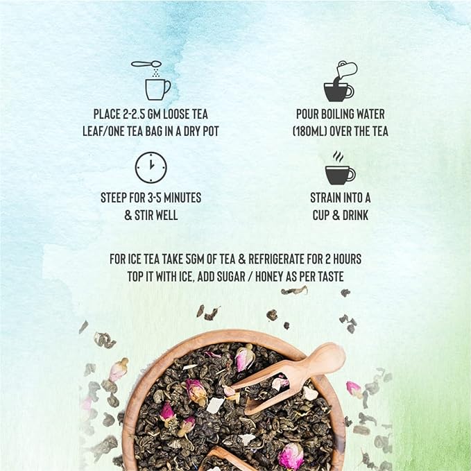 - Brewing Instructions 1. Place 2-2.5 Gm Loose Tea Leaf/One Tea Bag In A Dry Pot. (For Ice Tea Take 5 Gm) 2. Pour Boiling Water (180Ml) Over The Tea. 3. Steep For 3-5 Minutes & Stir Well. 4. Strain Into A Cup & Drink. (For Ice Tea Refrigerate 1 Hour Topped With Ice). Best Consume Without Milk. Add Sugar Honey & Sweetener As Per Taste.