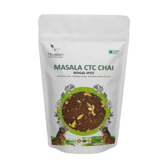• Tifusion Signature Masala Bengal CTC Tea is a carefully crafted blend featuring a combination of premium CTC tea leaves and a harmonious blend of aromatic spices, including cinnamon, cardamom, clove, ginger, and nutmeg.